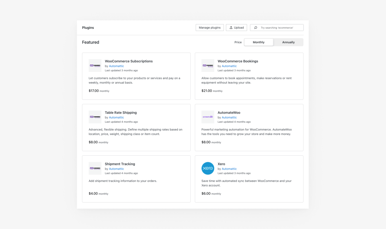 V důsledku toho nově umožňují nově zakoupit některé pluginy přímo na stránce zásuvných modulů WordPress.com. A nejen to, WordPress.com bude nabízet měsíční a roční ceny pluginů, což poskytuje majitelům stránek větší flexibilitu. Zpočátku můžete na stránce pluginů WordPress.com zakoupit šest nejoblíbenějších pluginů WooCommerce. Nákup pluginu prostřednictvím nového rozhraní WordPress.com je jednoduchý. Na stránce pluginů klikněte na jednu z karet placených pluginů a budete přesměrováni na stránku s podrobným výpisem produktů. Až budete připraveni, klikněte na tlačítko nákupu v pravém horním rohu stránky s výpisem produktů. Váš nákup nebude konečný, dokud na následující stránce nepotvrdíte způsob platby a údaje. Plugin se nainstaluje automaticky.