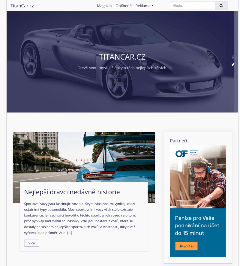 Magazín www.titancar.cz je optimalizován po vzoru úspěšných magazínu o autech a lze ho snadno rozšiřovat o zajímavé články. Vytvořte nové místo na internetu pro všechny milovníky aut, kutily a lidi co mají rádi čtení o tomto skvělém životním stylu.